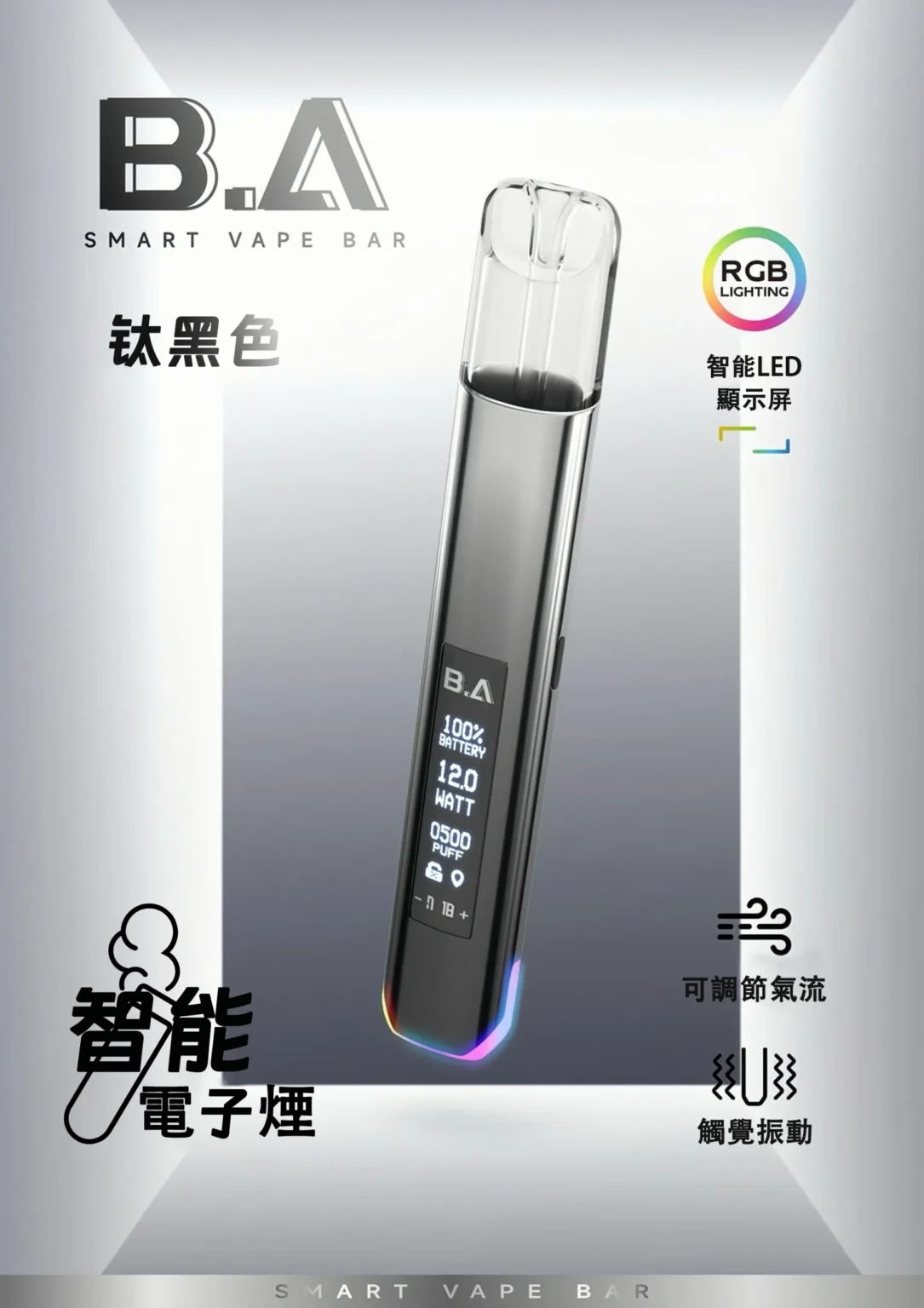 BA Smart Vape Bar 一代电子烟主机将科技、功能与美学完美结合,以智慧LED 显示、RGB 灯效、可调气流、Haptic 震动回馈与Type-C 快充,提供顶级的互动抽吸体验,是一代电子烟玩家的热销首选。